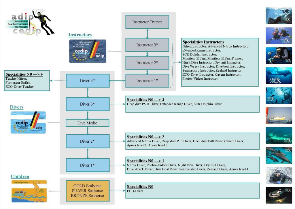 Les formations ADIP/CEDIP sont reconnues partout dans le monde et permettent de plonger avec des paliers de décompression. L’ADIP a élaboré des supports de cours précis ainsi que des standards pour chaque niveau de plongeurs et instructeurs (cours accessibles dès 14 ans).